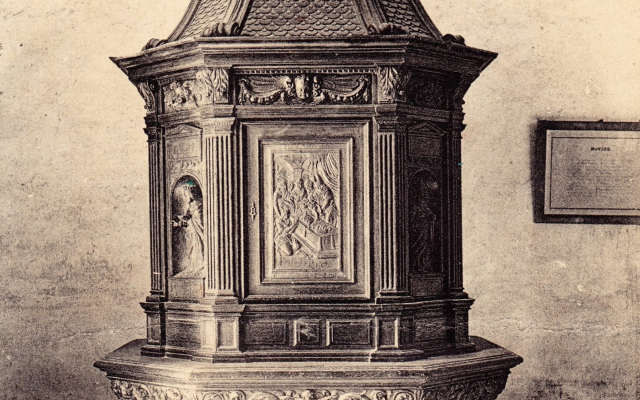 Ils se présentent sous forme d’une vasque de pierre quadrilobée, surmontée d’un ouvrage de bois sculpté en 1625 par M. HAMMERBERT, huchier originaire d’Essen en Allemagne. Les quatre faces principales sont décorées de bas-reliefs représentant l’annonciation, la présentation du temple, l’adoration des mages et le baptême du Christ, qu’accompagnent des statuettes représentant Saint Louis, Saint Jérôme et deux évêques.